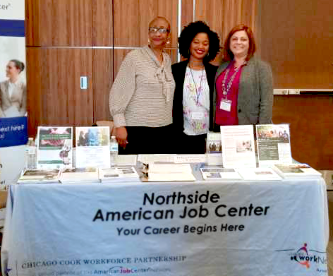Job Fair Planning Team Members: Pictured from left to right – front row: Maria Romero – Business Solutions Consultant, Healthcare Sector Center and Folasayo(Mary) Omiyale – Talent Development Specialist, Northside American Job Center; Back row – left to right: Enisa Jakupovic – Project Director, Healthcare Sector and Northside American Job Centers; Kathleen Brannigan – Business Relations Specialist, Chicago Cook Workforce Partnership; Carlos Valentin – Healthcare Sector Center Manager; Tonitha Sims – Talent Engagement Specialist, Healthcare Sector Center; Michelle McFarland – Business Solutions Consultant, Healthcare Sector Center; Sara Dodeci – Regional Director, ResCare Workforce Services; Franklin Turner – Business Solutions Consultant, Northside American Job Center; Lilia Trejo – Talent Development Specialist, Healthcare Sector Center; Brittany Wille – Talent Development Facilitator, Northside American Job Center; Erika Franco – Business Solutions Consultant, Northside American Job Center; Eleanor Richards – Talent Development Specialist, Northside American Job Center; and Tracy Lane Conway – Business Solutions Consultant, Northside American Job Center.