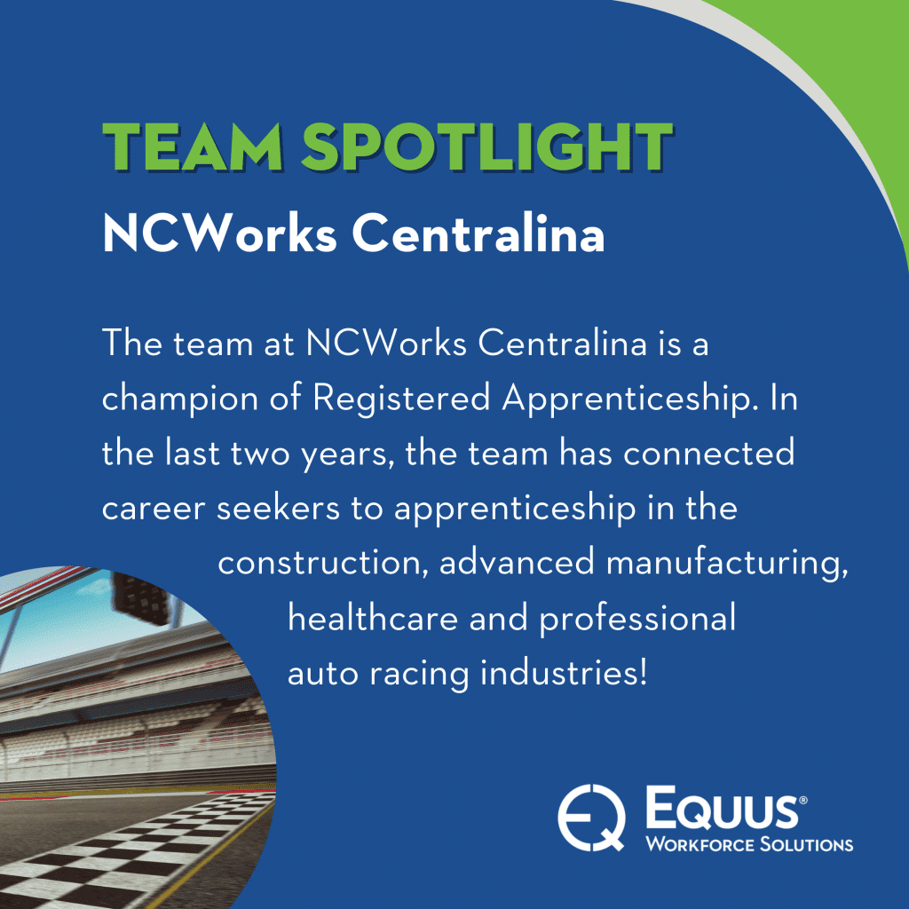 Leading up to National Apprenticeship Week, we are excited to spotlight Equus Workforce Solutions teams across the country who are champions for Registered Apprenticeship in their communities. The NCWorks Centralina team has supported career seekers to enter apprenticeship opportunities in both traditional and non-traditional occupations. From a traditional machinist position to occupations such as a Paramedic and Medical Records Manager. The team has even helped an apprentice with a NASCAR Pit Crew program!